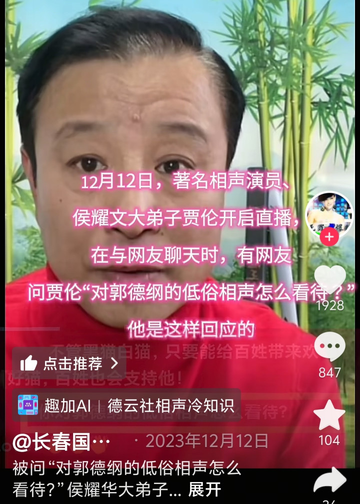 第四,相关的贾仑老师出镜视频,最早可以翻找到2023年12月12日的录屏内容,此次有人说成是“郭德纲被约谈后”分明是偷换了时间节点。